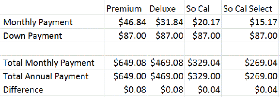 For the Premium and Deluxe passes, you save $0.08 by paying annually. For the Southern California and Southern California Select passes, you save $0.04 by paying annually. This difference is obviously very small, and students could potentially argue two ways. Students may say that paying annually saves the most money (4 or 8 cents), however that is less than the amount someone would earn by keeping the money they would have used for an annual payment in a bank account that collects interest. So, as long as the students have a good justification, I would accept either answer.