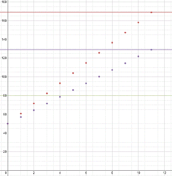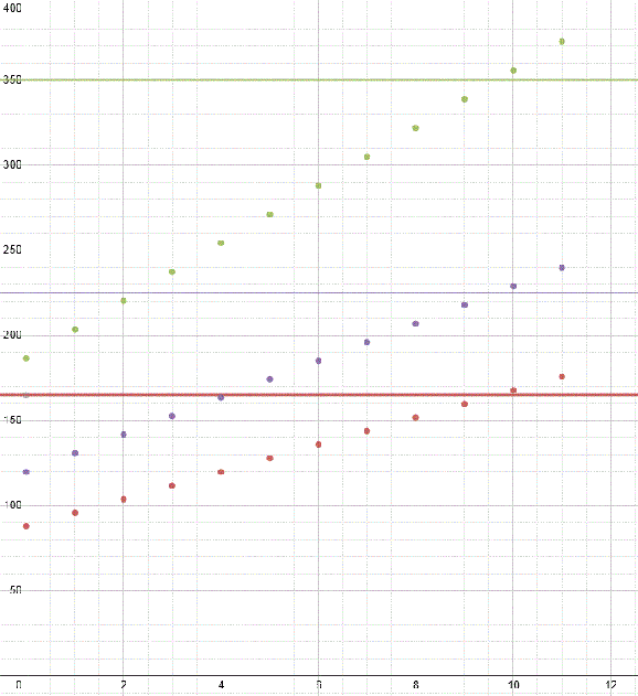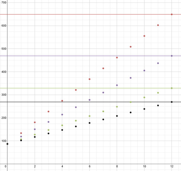 - The monthly payment plan is represented by individual points. Technically it is a continuous step function (as opposed to a discrete function) because instead of going up linearly, the total amount paid stays exactly the same over the course of the month until it jumps up when the next monthly payment is paid, repeating the process throughout the year. However when I graphed it as a step function, it was very hard to read. So, I left it as individual points.