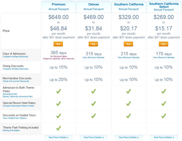 Disneyland has four plans to choose from: Premium, Deluxe, Southern California, and Southern California Select with pricing listed below.