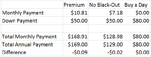 For the Premium and No Black-Out passes, you actually lose $0.09 and $0.02 by paying annually. So for those two passes, you save the most money by paying monthly. For the Buy a Day pass, that is a pass where if you pay $80 for one day, you get the rest of the year free. As such, it is essentially an $80 annual pass with no monthly payment option.