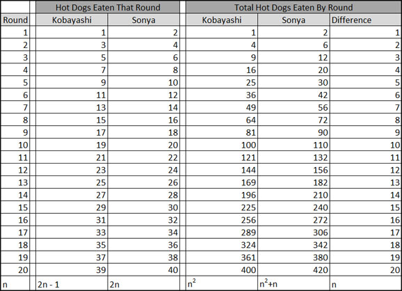 Something important to note is that there are many ways to get the answers. For example, with question 7, one student might notice that Kobayashi eats one less hot dog each round and so after n rounds, he has to eat n hot dogs to catch up. Another students might reason that after n rounds, Kobayashi has eaten n^2 hot dogs and Sonya has eaten n^2+n hot dogs. Subtraction the n^2 from n^2+n leaves just n, which is how many hot dogs behind he is. Those are two different approaches that give the same answer, and it would make for a great discussion as to how that happened.