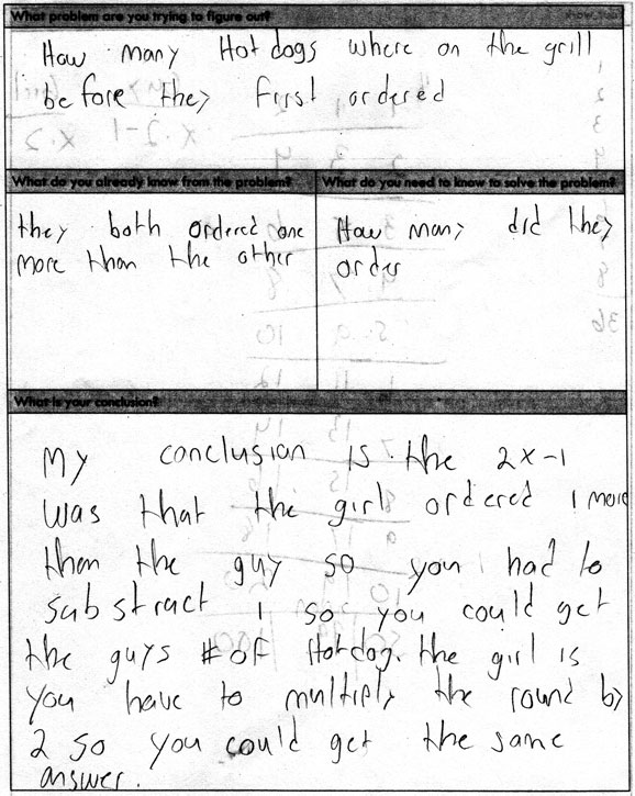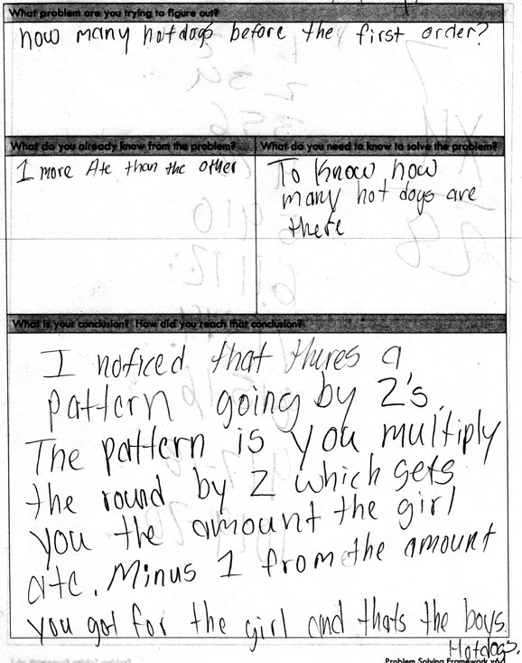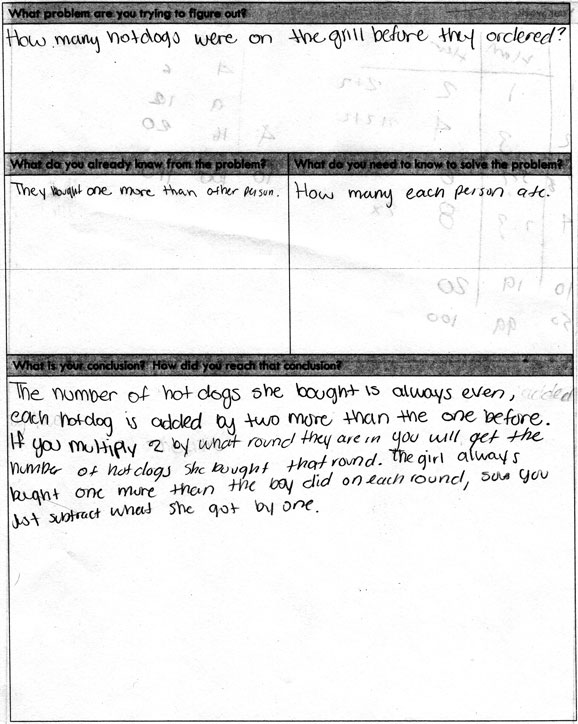 Below are two low, medium, and high work samples for this problem along with comments explaining how I classified it. Note that the conclusions were actually answering the question, “How many hot dogs would each person eat in Round n?”